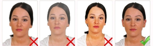 Başın konumu dik olmalı, baş herhangi bir yöne dönük olmamalıdır. Fotoğraf gülme vb. mimikler olmadan, ağız kapalı olarak çekilmelidir.